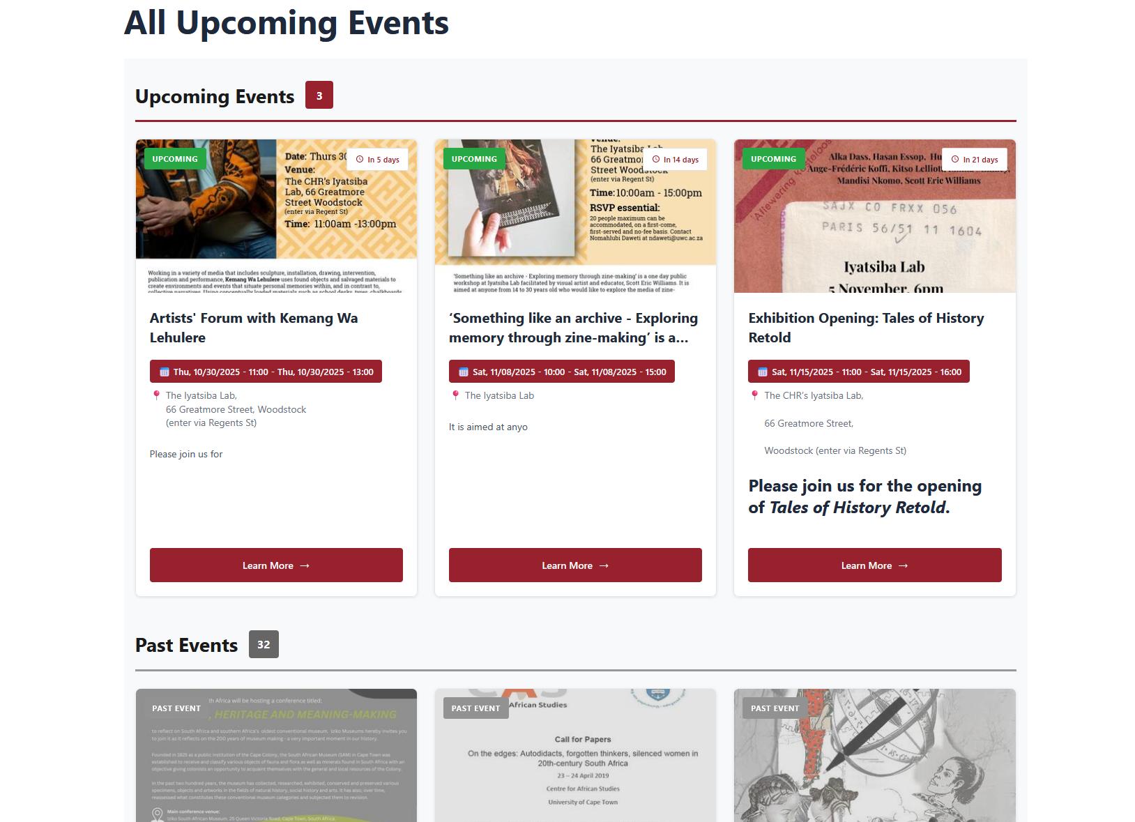 This relationship with time - how we capture it, organise it, and make it accessible - brings me to SAHO's newest feature. After years of working with temporal data in these historical archives, we have launched a comprehensive Events platform that bridges past and future, archive and action.