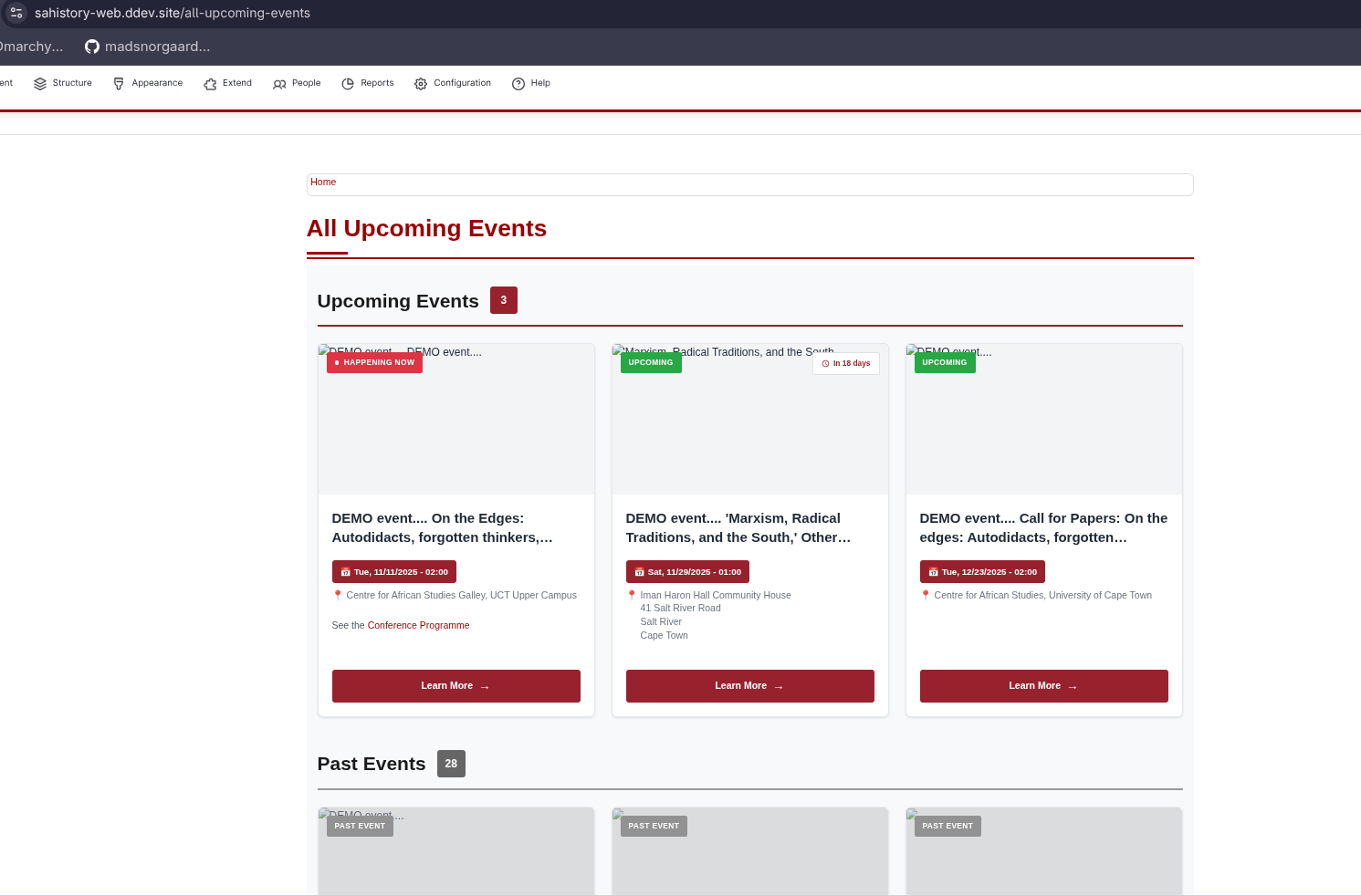 The new Events section is not just a calendar - it is a living timeline where South African history continues to unfold. Built with Drupal's powerful content management capabilities, it handles the complex temporal states that real cultural events demand. A conference can be "happening now" while still having "upcoming" sessions. An exhibition exists simultaneously in multiple temporal dimensions - as a current experience for today's visitors and as tomorrow's historical record.